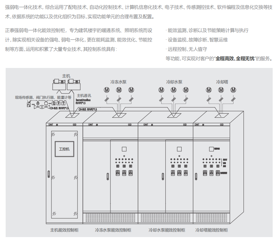 強弱電一體化技術(shù),綜合運用了配電技術(shù)、自動化控制技術(shù)、計算機信息化技術(shù)、電子技術(shù)、傳感測控技術(shù)、軟件編程及信息化交換等技術(shù),依據(jù)系統(tǒng)的功能以及優(yōu)化組織為目標,實現(xiàn)功能單元的合理布置及配置。 正泰強弱電一體化能效控制柜,專為建筑樓宇的暖通系統(tǒng)、照明系統(tǒng)而設(shè)計,除實現(xiàn)相關(guān)設(shè)備的強電、弱電一體化,更在能耗監(jiān)測、能效優(yōu)化、節(jié)能控制等方面,運用和積累了大量專業(yè)技術(shù)。