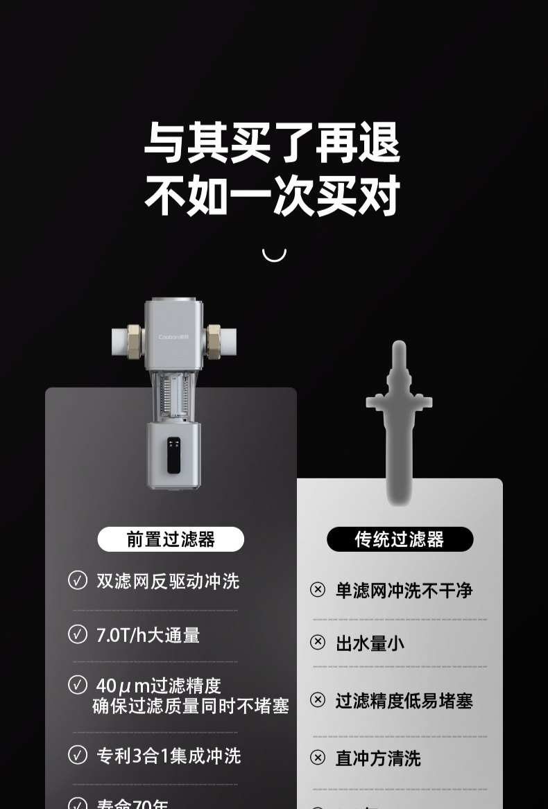 40μm精濾密度,316L不銹鋼濾網,雙刷水動力反沖洗,全息流道銅頭,免換濾芯